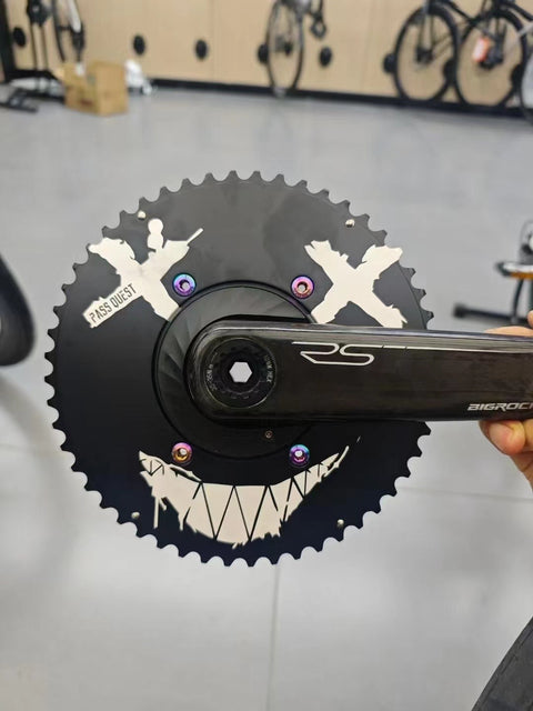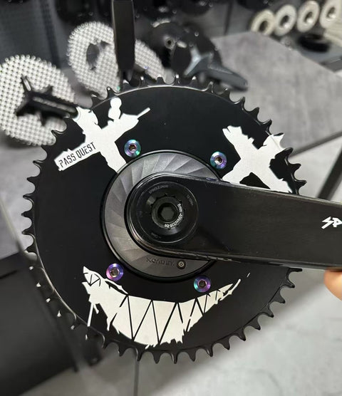 • RF Chainring is made of the whole aluminum plate by CNCmilling. The back is hollowed and chamfered,ensuringthe strengthand reducing the weight of the gear disc! The tooth plate adopts alengthened tooth shape, and the teeth exceed the chain a lot, evenif the chain beats violently, it is difficult to get out ofthe teeth, so as not to drop the chain.